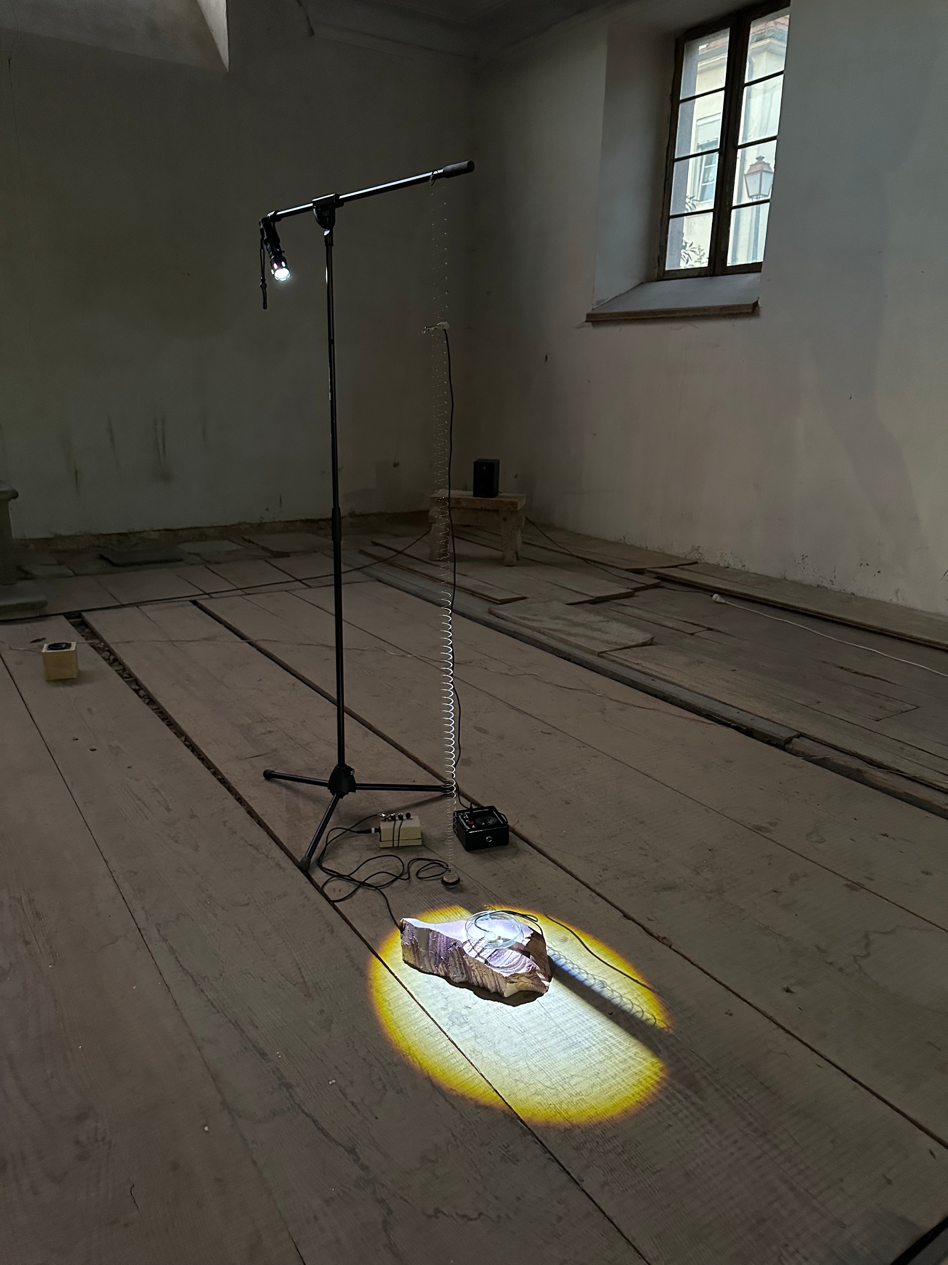 6 stones: I – 1045 g, II -1647 g,… the sum of their weights is equal to the “mother stone” they are all cast from. Fragile balance of mother stone and her copies shifts with humidity and micro-tensions releasing the sound of friction, that resonates in the whole bodies of “children stones”, as if they were singing choir responding to the lullaby of their mother.